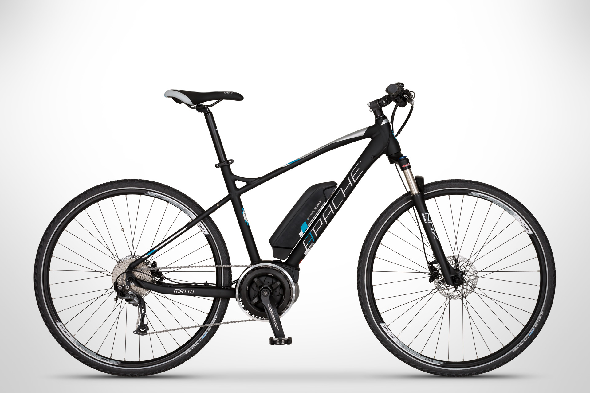 Vytvořit špičkové krosové elektrokolo v cenově dostupnějším, stále však velice kvalitním a atraktivním provedení. S tímto nelehkým úkolem se pravidelně potýkáme každou sezonu a ani ta letošní nebyla v tomto ohledu výjimkou. Výsledkem naší práce je sportovní krosové elektrokolo Apache Matto Active Plus, model s lehkým a zároveň tuhým hliníkovým rámem a novou řadou středového elektromotoru s vysokým točivým momentem. Se vzduchovou odpruženou vidlicí a hydraulickými kotoučovými brzdami se nemusíte zdržovat pouze na hladkých silnicích a cyklostezkách, překážkou vám nebudou ani zpevněné polní a lesní cesty či lehčí terén. Ať vyrazíte na svižnou sportovní vyjížďku, nebo na pohodový výlet s rodinou, Matto vám bude vždy náležitou oporou.