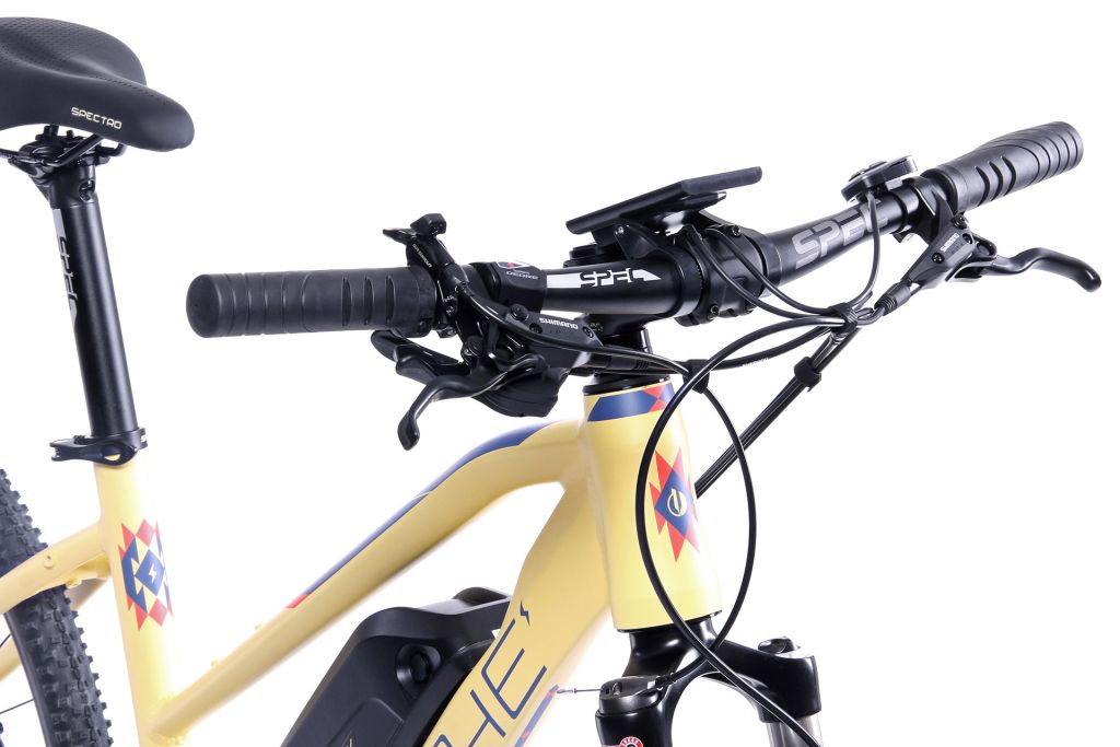 Do detailu propracovaný hliníkový rám doplňuje vzduchová vidlice SR Suntour NCX D Air RL-DS se zdvihem 63 mm a zamykáním z řídítek. Kola o rozměru 28“ jsou zapletena na nábojích Shimano Alivio a pevných hliníkových ráfcích Remerx Top Disc. Pohonnou soustavu tvoří desetirychlostní sada Shimano Deore s kazetou Shimano Alivio a klikami Bafang MaxDrive. Z nabídky značky Shimano pocházejí rovněž hydraulické kotoučové brzdy s označením Acera M396. Široká řídítka, krátký představec, ale také sedlovka a sedlo nese logo české značky Spectro.